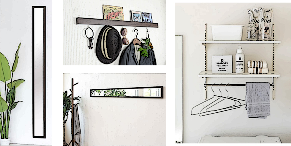 玄関の横や部屋に鏡を設置する事や壁にピクチャーレールを設置して洋服やちょっとした物をひっかけられるようにする…