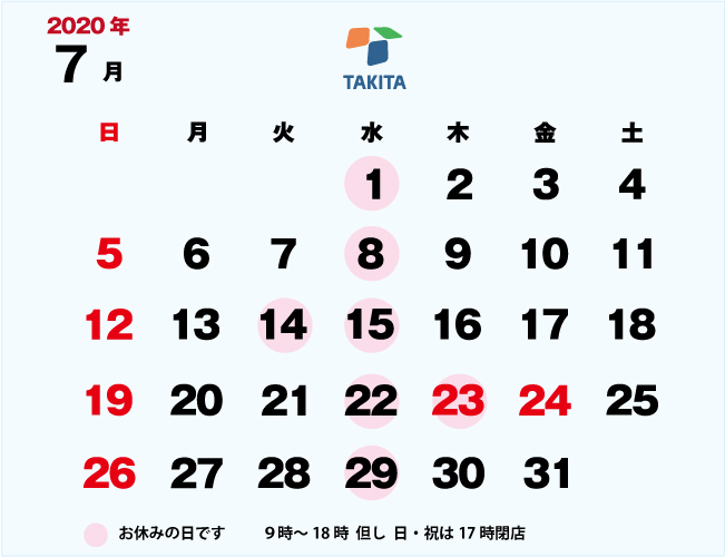 タキタ産業は7月も連休を2回取らせていただきます。 せっかくご来店頂いても休みだったという事が無いように事前にお問い合わせいただければと思います。