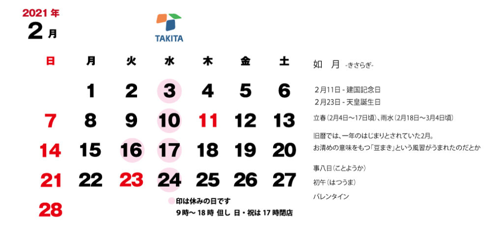 2021年1月も終わりに近づき、2月の弊社の予定を掲載させていただきます。