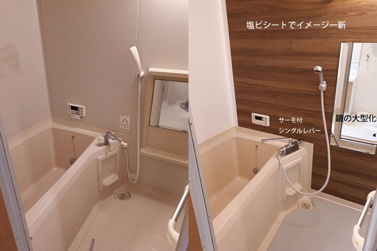 交換は出来ないけれどきれいにしたい…そんな時に塩ビシートや鏡の取替、そして2口蛇口のタイプからサーモ付のシングルタイプへの変更