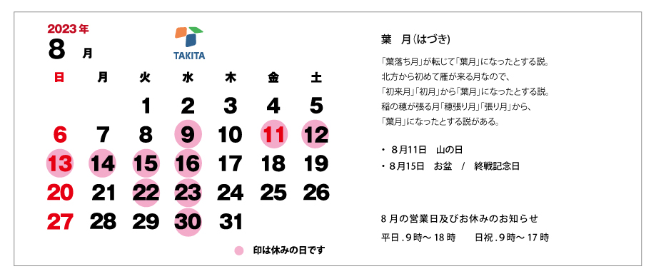 8月は少し暇になってくることもあり夏季休業も含めて少し多めの休みをいただきます。