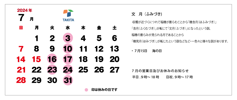 7月の予定表が出来ましたので掲載いたしました。 祝日は15日の海の日だけですが学生さんは夏休みに入りますね。