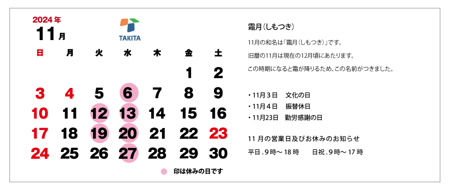 11月の予定表が出来上がりました。月半ばに連休を2回取らせていただく予定です。