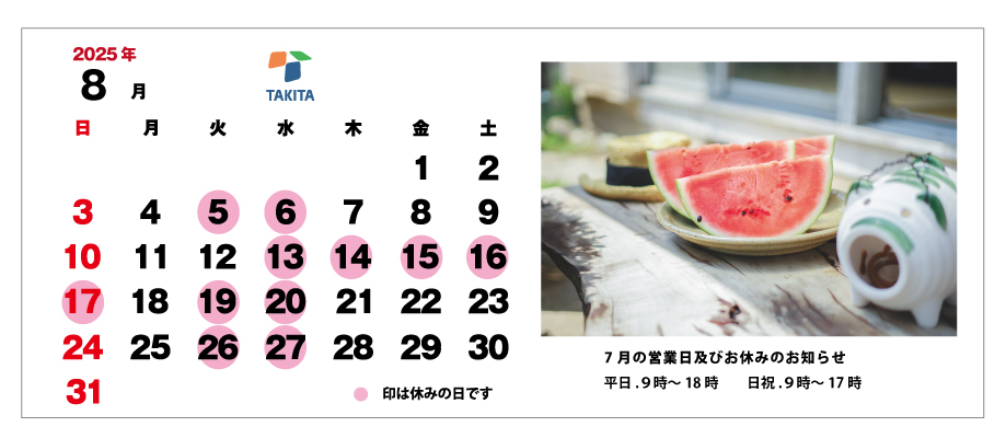 恒例のお盆前後と火曜日・水曜日が休みです。但しお盆直前の12日火曜日は営業予定となっています。