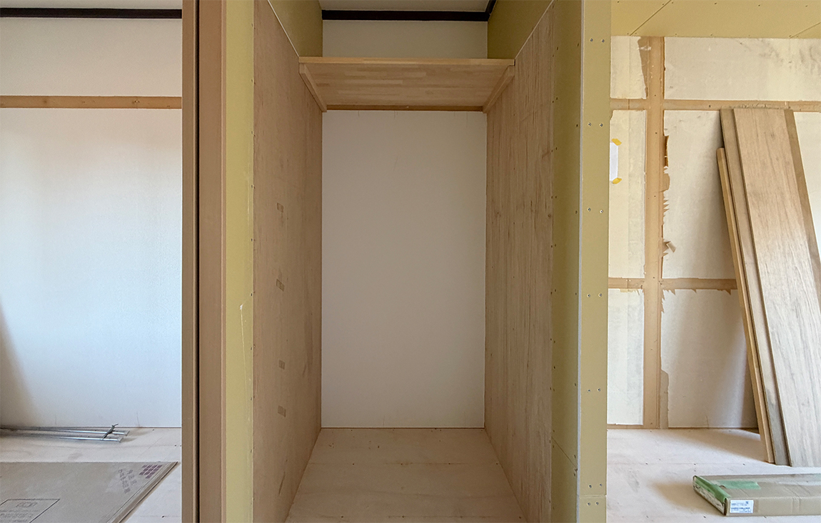 間のスペースは扉を付けないハンガースペースです。