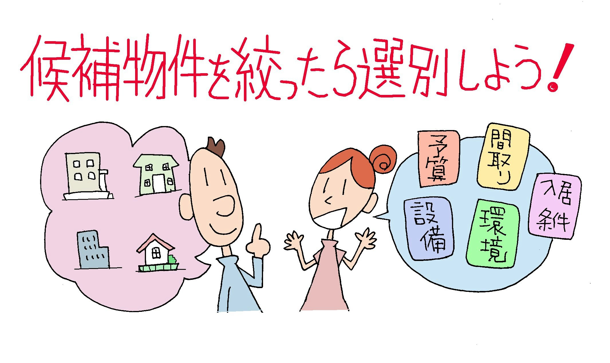 物件の選別では家賃が毎月払えるかどうか、入居条件はどうか、設備が古くないかなどをチェックしましょう